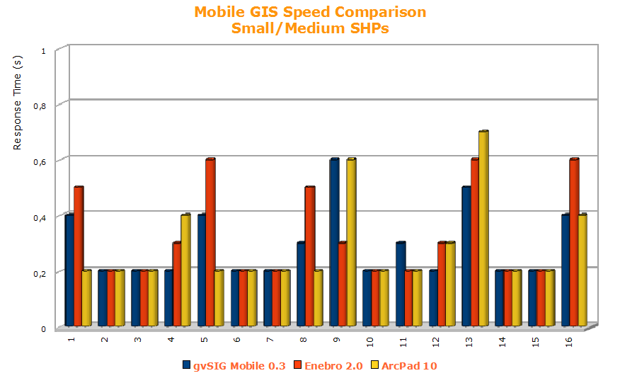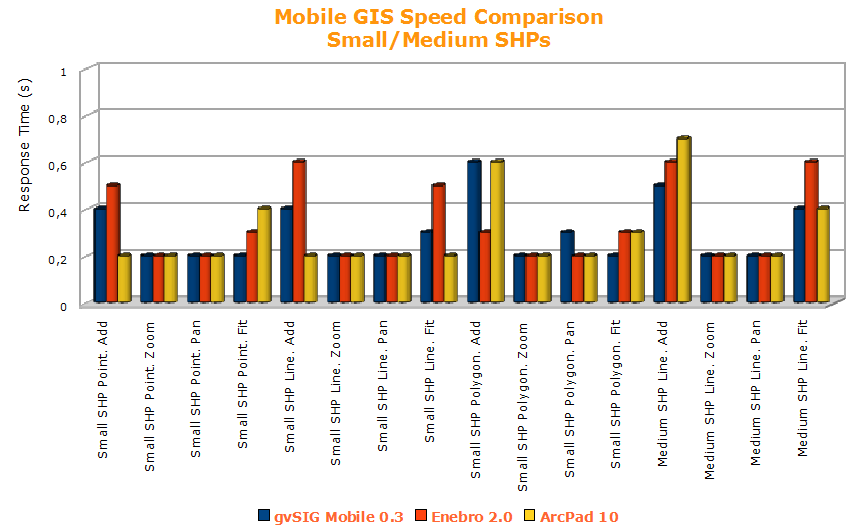Comparison of Mobile GIS. Image with a char containing the speed test results for vectorial layers (low and medium sizes).