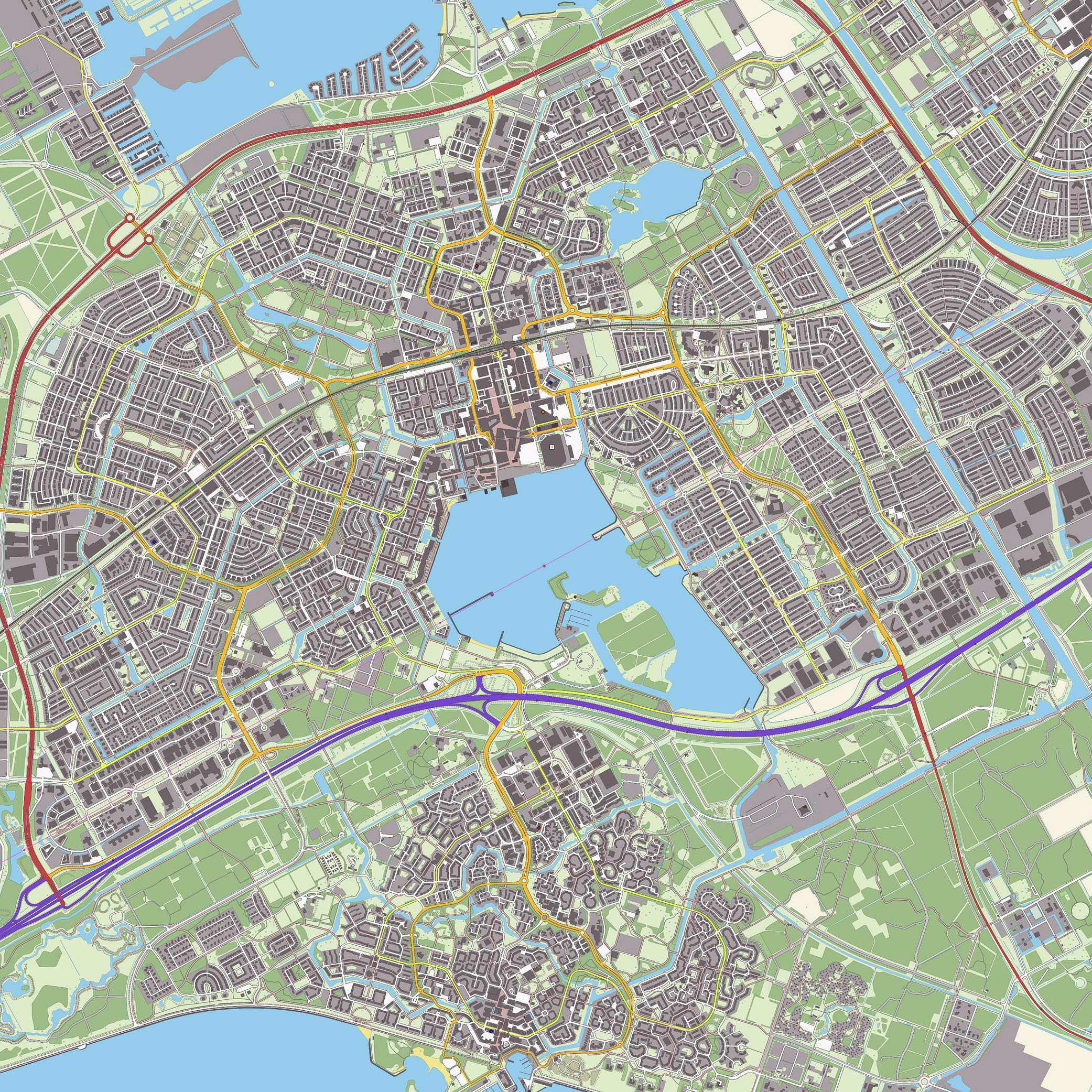 Top10NL, Almere. Op basis van de GML open geodata van de Top10NL (basisregistratie Topografie, Kadaster 2011), vrijgegeven door Kadaster op 1-1-2012 onder de Creative Commons BY licentie. Samenstelling en kleurenschema: Jan-Willem van Aalst