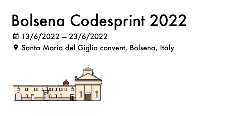 Our last code sprint in Bolsena - Italy was in 2019. And this year we are back! The code sprint is planned for an extended period of 10 days, giving all that participate a chance to work and meet a little bit longer.