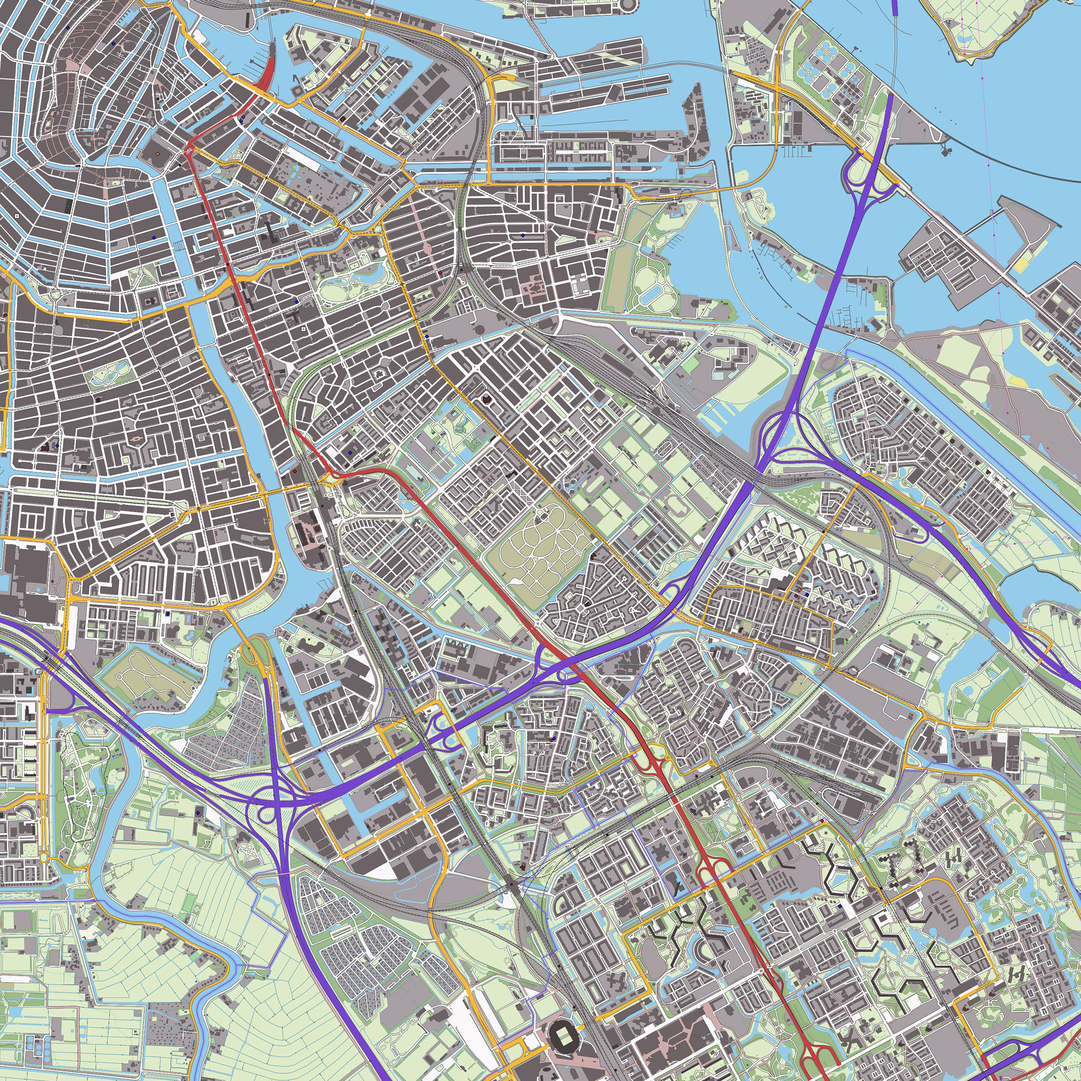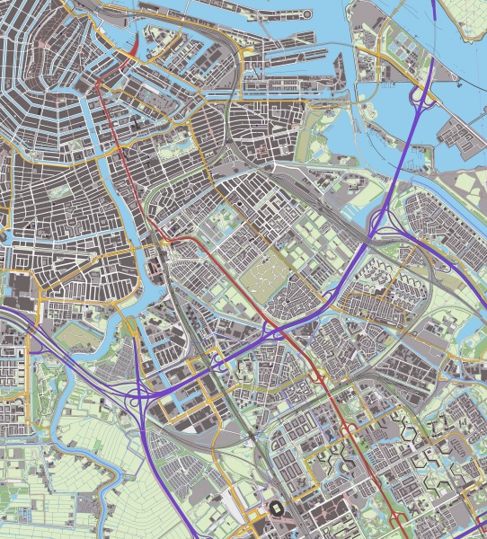 Top10NL, Stukje Amsterdam. Op basis van de GML open geodata van de Top10NL (basisregistratie Topografie, Kadaster 2011), vrijgegeven door Kadaster op 1-1-2012 onder de Creative Commons BY licentie. Samenstelling en kleurenschema: Jan-Willem van Aalst