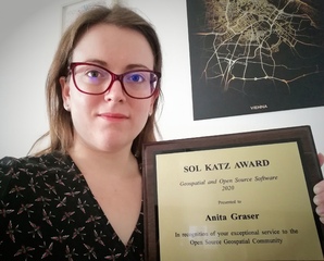 Anita Graser accepting the 2020 Sol Katz Award at the OSGeo AGM.
