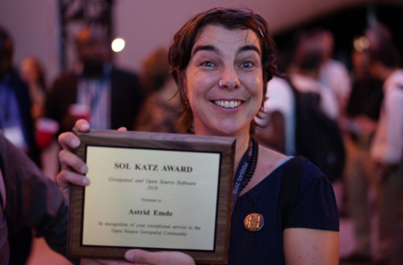 Astrid Emde just after receiving the 2018 Sol Katz Award, on 29 August 2018, at FOSS4G-Dar es Salaam.