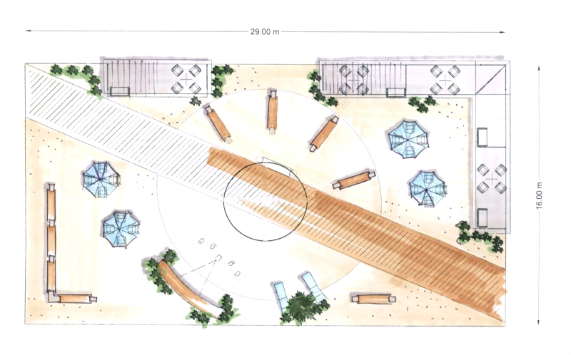 sketch/drawing of a booth floor plan with theme "beach"