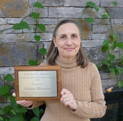 Helena Mitasova posing with the 2010 Sol Katz Award, that she received at FOSS4G Barcelona.