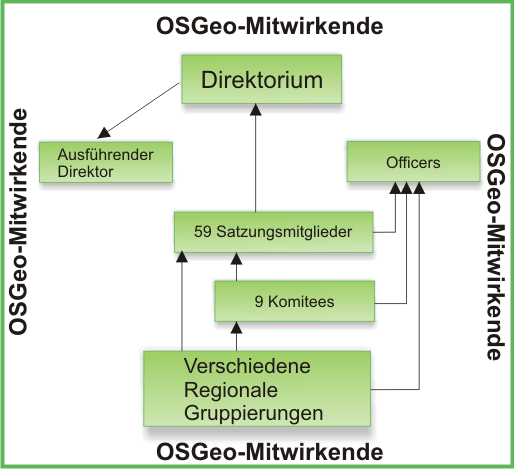 Die OSGeo ist eine gemeinnützige (non-profit) Organisation und wurde im Februar 2006 bei einem Treffen in Chicago, USA durch 24 Satzungsmitglieder (Charter Members) ins Leben gerufen. Diese wählten aus ihren Reihen anschließend 5 Mitglieder in das Direktorium, welches in der Folge juristisch verantwortlich wurde und die Geschäfte steuert. In den darauf folgenden Wochen kamen weitere Satzungsmitglieder hinzu, die wiederum per Wahl das Direktorium auf 9 Mitglieder erweiterten. Im Sommer 2007 wurden weitere Satzungsmitglieder nominiert und hinzugewählt. Von den derzeit 59 Mitgliedern kommen drei aus dem deutschsprachigen Raum, die ersten zwei sind auch Mitglieder im Direktorium: Arnulf Christl (Bonn), Markus Neteler (derzeit wohnhaft in Italien) sowie Jan-Oliver Wagner (Osnabrück).