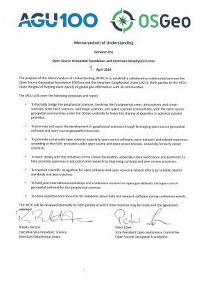 - The MoU between AGU and OSGeo was signed at EGU General Assembly in Vienna (April 9 2018)